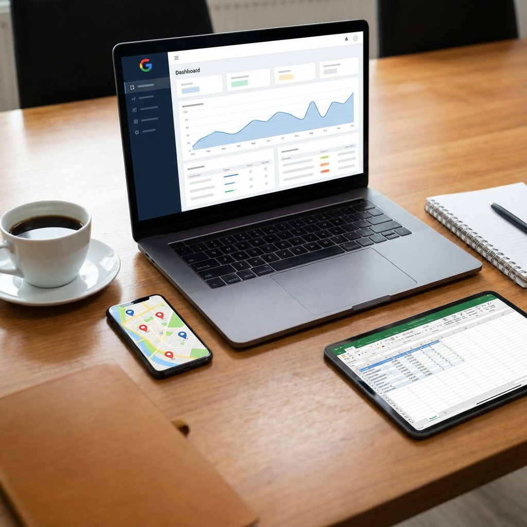 Pour structurer l’audit, l’idéal est de consolider l’ensemble des données dans une vue de synthèse claire et régulière. Celle-ci doit intégrer les indicateurs suivis dans le temps, comme la variation des positions locales, le volume de trafic généré, ainsi que l’impact sur les interactions issues de la fiche locale, notamment les appels, les demandes d’itinéraires et les prises de contact. L’ajout d’indicateurs complémentaires, tels que le nombre d’avis clients, la fréquence des réponses ou l’évolution globale du classement, renforce la lisibilité de la performance locale.
