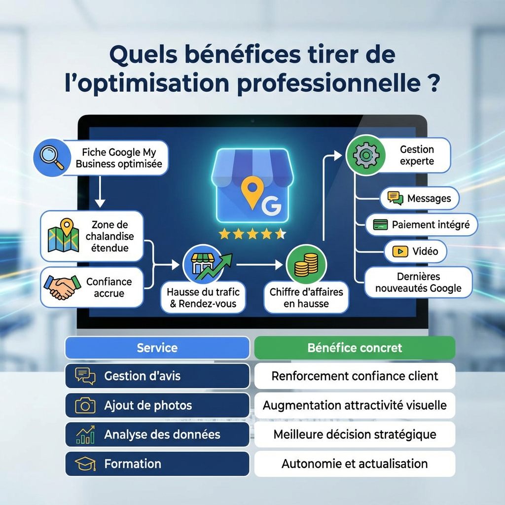 La gestion des avis contribue au renforcement de la confiance client, tandis que l’ajout de photos améliore fortement l’attractivité visuelle de la fiche. L’analyse des données facilite une prise de décision stratégique plus pertinente, et la formation apporte une autonomie durable dans la mise à jour des contenus et la gestion quotidienne du profil.