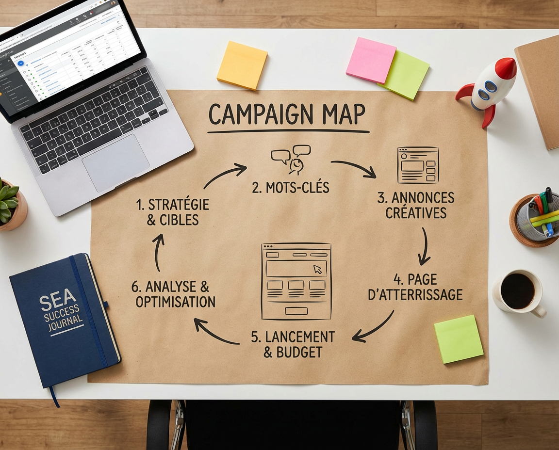 Tout commence par un audit détaillé de l’existant et une compréhension fine de vos besoins. Ensuite, le processus inclut la sélection des bons mots-clés, la rédaction d’annonces percutantes et la mise en place du suivi des conversions.